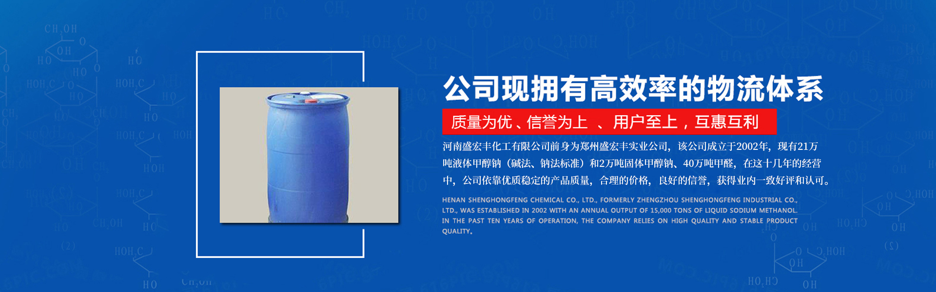 河南盛宏豐化工有限公司前身為鄭州盛宏豐實(shí)業(yè)公司,公司成立于2002年,在鄭州盛宏豐實(shí)業(yè)公司這十幾年的經(jīng)營(yíng)中,公司依靠?jī)?yōu)質(zhì)穩(wěn)定的產(chǎn)品質(zhì)量,合理的價(jià)格,良好的信譽(yù),獲得業(yè)內(nèi)一致好評(píng)和認(rèn)可,為了滿足市場(chǎng)需求,順應(yīng)大眾創(chuàng)新的潮流,鄭州盛宏豐實(shí)業(yè)有限公司利用自身技術(shù)優(yōu)勢(shì)又于2013年在河南開封成立了河南盛宏豐化工有限公司,并投資6億元在開封市精細(xì)化工產(chǎn)業(yè)集聚區(qū)建設(shè)21萬(wàn)噸液體甲醇鈉(堿法、鈉法標(biāo)準(zhǔn)和2萬(wàn)噸固體甲醇鈉、40萬(wàn)噸甲醛項(xiàng)目以及相關(guān)下游產(chǎn)品,生產(chǎn)出的甲醇鈉產(chǎn)品達(dá)到了超低水份、高活性,使產(chǎn)品品質(zhì)得到大幅升級(jí),一舉打造出甲醇鈉產(chǎn)品在世界上的新高度。